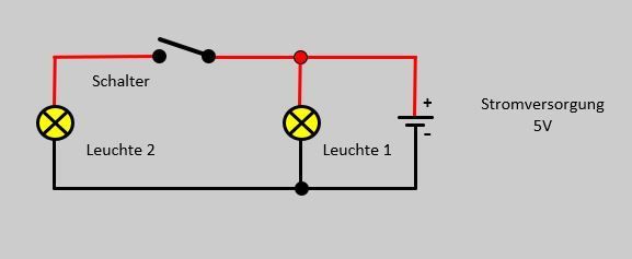 Schaltung 1 und 2 können natürlich auch parallel aufgebaut werden. Leuchte 1 ist direkt mit der Stromquelle verbunden und leuchtet somit immer. Leuchte 2 wird über den Schalter mit dem plus Pol der Stromversorgung verbunden und leuchtet somit immer nur wenn der Schalter geschlossen ist.