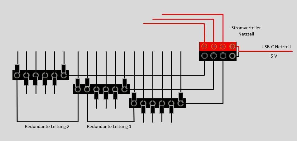 Verbindet man noch zusätzlich die Stromverteiler untereinander (Redundanzleitungen) so wird die Verfügbarkeit deutlich erhöht. Auch wenn ein Stecker aus einer Stromverteilung gezogen wird, werden die meisten Leuchten noch über die Zweitleitungen versorgt.