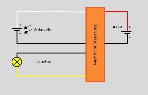 Das Nachtlichtmodul enthält alles was nötig ist um tagsüber einen Akku über eine Solarzelle aufzuladen und dann, wenn es dunkel wird eine Lampe zum leuchten zu bringen. Zum Schutz des Akkus wird die Leute ausgeschaltet, wenn der Akku zu leer ist um eine vollständige Entladung zu vermeiden.