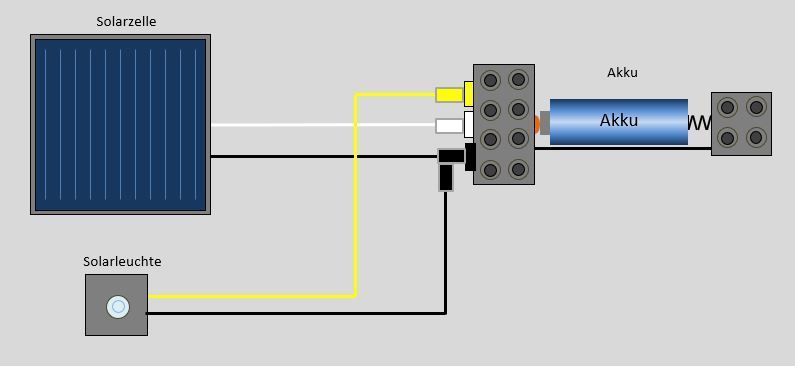 Und hier die Schaltung mit den Komponenten aus unserem Shop. Für die Stromversorgung wird die Standard Solarzelle mit einer Spannung von 2 V verwendet. Die Leuchte ist eine spezielle LED-Leuchte, die mit nur einem Akku über das Steuermodul betrieben werden kann.
